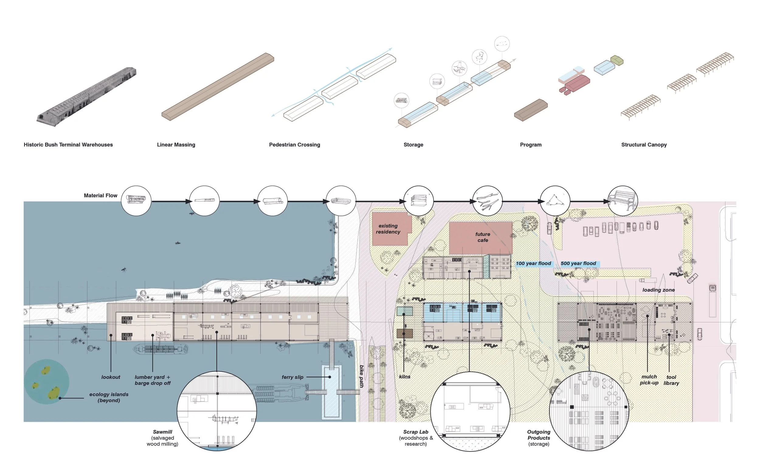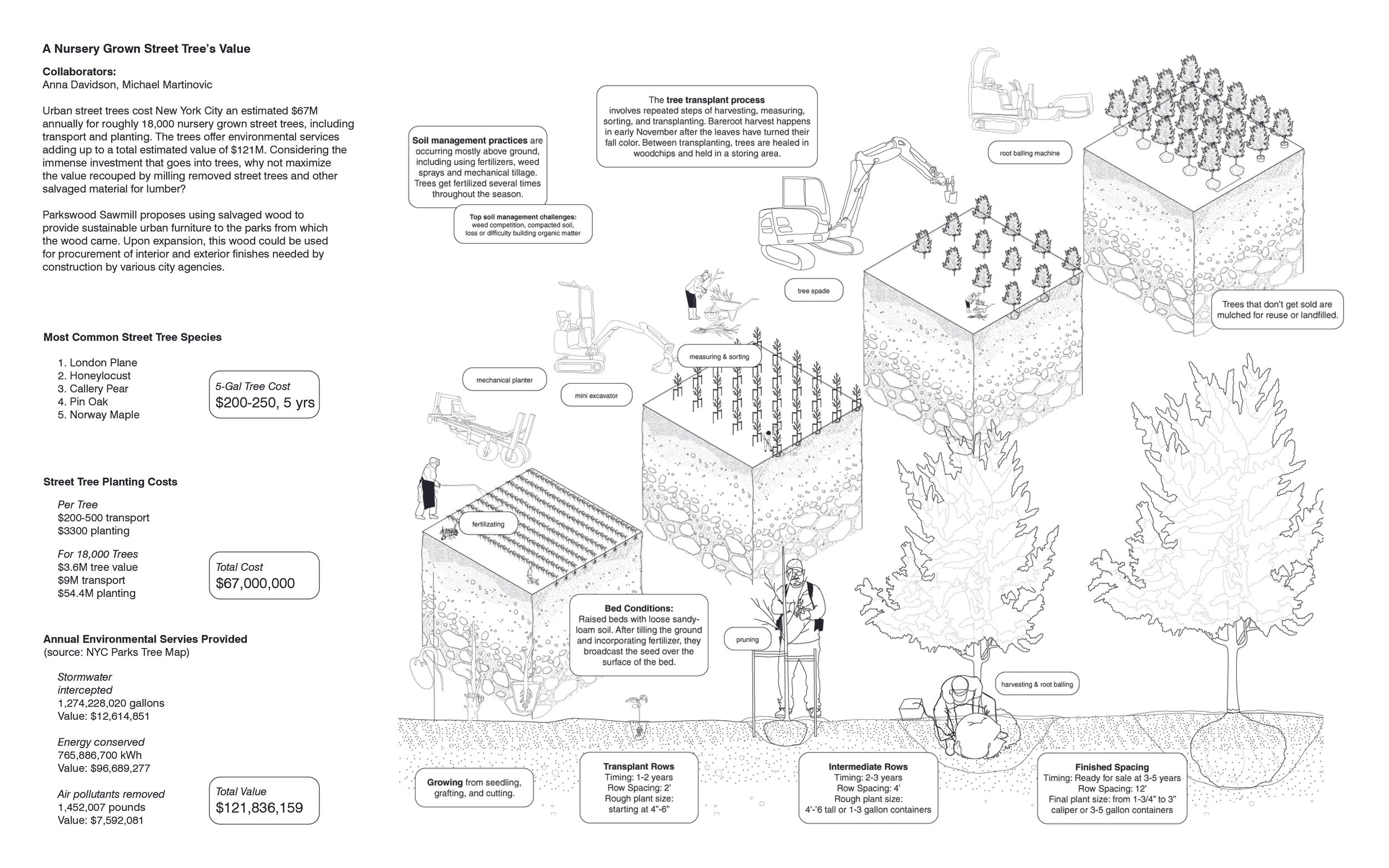 Addressing the NYC Parks Department’s call to make better use of the 12,000 street trees annually cut down, ParksWood integrates itself within the city’s existing systems and proposes repurposing 100% of the trees. This urban sawmill is designed as a new site for milling reclaimed wood, for workforce training in traditional woodworking and robotic research, as well as for production of Parks procured outdoor furniture products.
